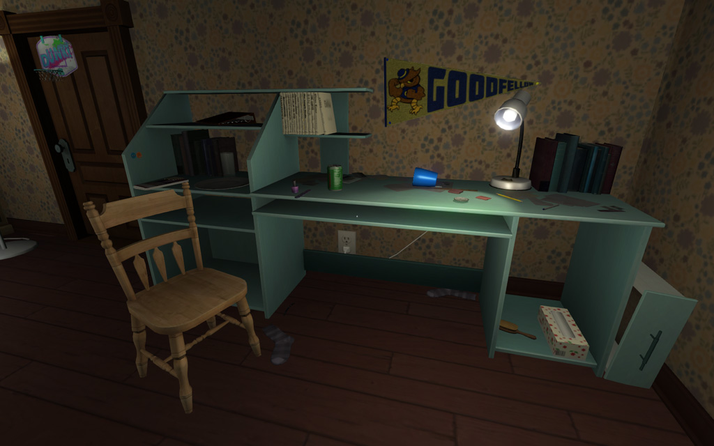 Gone Home reveals its story through audio diaries and the environment itself. The former, which come from Sam’s journal, are able to describe what the environment cannot: events that leave no evidence, or events outside the house. The audio diaries also require little interpretation from the player, since they are already Sam’s interpretation of events and details. Instead, they function as a supportive structure for what the player observes in the environment. Some details, like letters or notes passed in class, are as revealing as the audio diaries. Others, like a letter Kaitlin’s dad conveniently saved from twenty years before the story’s events, allow for exposition. These may be necessary to present the player with a coherent story, and they are mostly believable, but the moments where Gone Home’s environmental storytelling works best are more subtle.