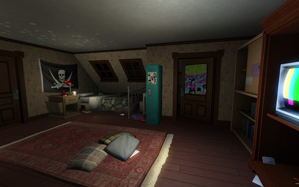 The best definition I’ve found for environmental storytelling comes from the talk, “What Happened Here?” that Matthias Worch and Harvey Smith gave at the 2010 Game Developers Conference. (I recommend listening to the recording and reading the slides if you haven’t already.) Worch and Smith define environmental storytelling as “Staging player-space with environmental properties that can be interpreted as a meaningful whole, furthering the narrative of the game.” This definition fits the examples Worch and Smith give in their talk, and it also fits with most of Gone Home, but their emphasis in the talk—especially their practical tips for environmental storytelling—is on creating chains of events where the player is trying to solve the puzzle of what happened. This is the forensic approach, which has its uses, but it doesn’t explain how some of the stronger moments in Gone Home work.